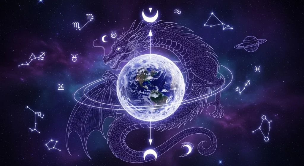 Astrologicamente, um eclipse acontece quando Sol, Lua e Terra se alinham próximos aos nodos lunares. Esses pontos não são planetas, mas interseções invisíveis entre a órbita da Lua e o caminho do Sol no céu.